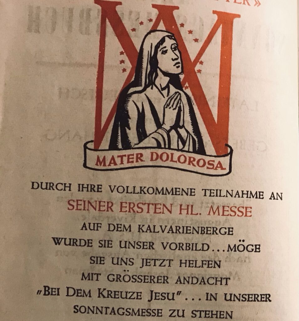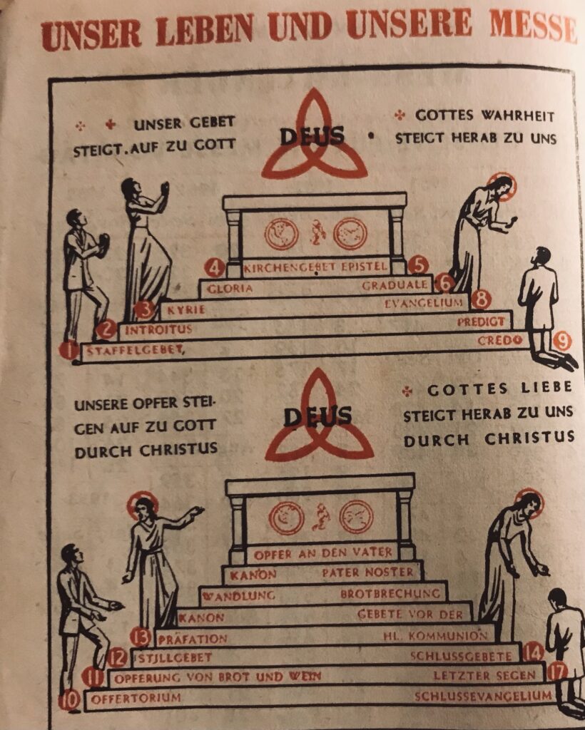 Das Grundgesetz des Christentums und darum das der Messe ist die Opferidee. (…) Was ist Opferung? Opferung ist ein Doppeltes. Bekenntnis und Tat. Die Opferung glaubt und gibt. Die auf der Patent zum Himmel gehobene Hostie zuerst ein Bekenntnis. Anerkennung der wichtigsten religiösen Tatsache: Ich bin Gottes. (…) Man muß Gott geben, was Gottes ist. (…) Wenn man mitmacht – und wir müssen bei der Messe mitmachen – dann glauben wir wieder an das souveräne göttliche Eigentumsrecht und Verfügungsrecht über alle irdischen Dinge.